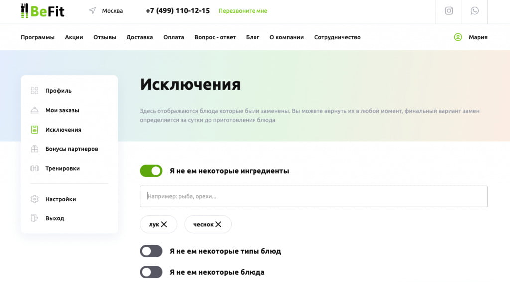 Возможности личного кабинета “BeFit”